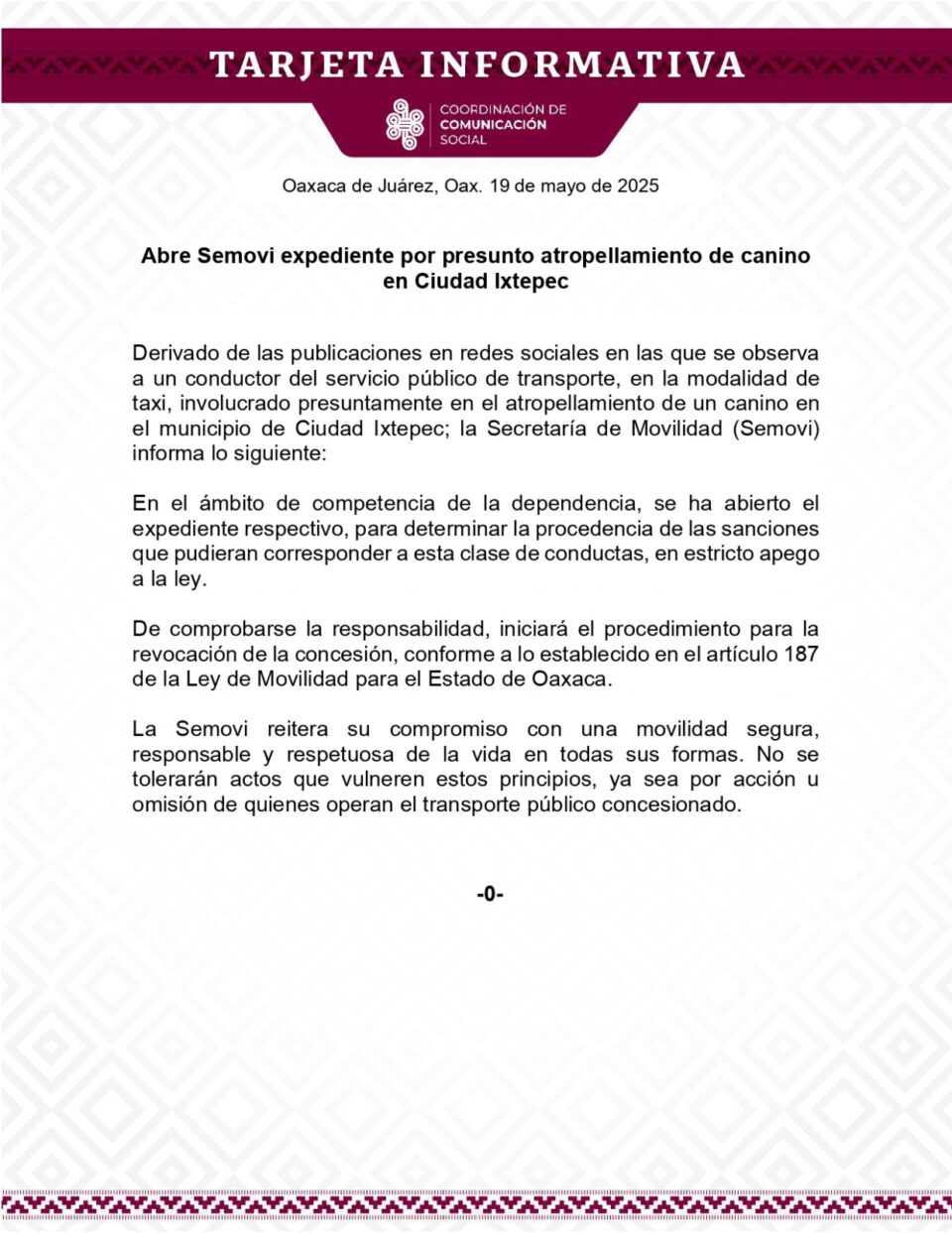 Derivado de las publicaciones en redes sociales en las que se observa a un conductor del servicio público de transporte, en la modalidad de taxi, involucrado presuntamente en el atropellamiento de un canino en el municipio de Ciudad Ixtepec; la Secretaría de Movilidad (Semovi) informa lo siguiente: