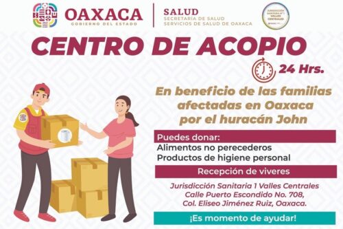 Oaxaca de Juárez, Oax. 27 de septiembre de 2024.- El Consejo Estatal de Protección Civil a través de Servicios de Salud de Oaxaca (SSO), habilitó cuatro centros de acopio en las sedes Jurisdiccionales de Valles Centrales, Istmo, Mixteca y Sierra, como un esfuerzo solidario y humanitario para ayudar a quienes resultaron afectados por el paso del huracán “John”.