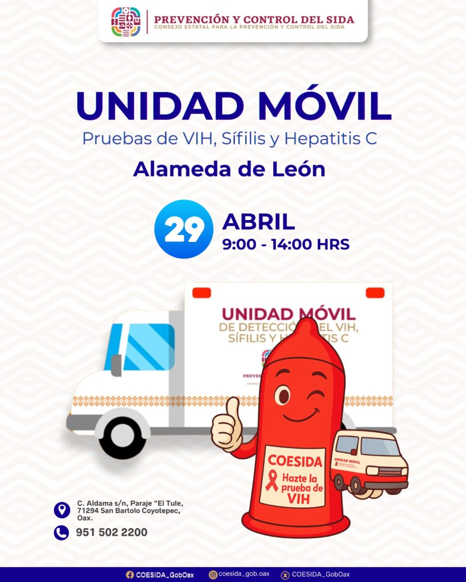 El Consejo Estatal para la Prevención y Control del Sida (Coesida) invita a la población acudir a la Alameda de León de la capital oaxaqueña para realizarse pruebas rápidas del Virus de Inmunodeficiencia Humana (VIH), Sífilis y Hepatitis C, de manera gratuita, confidencial y segura.