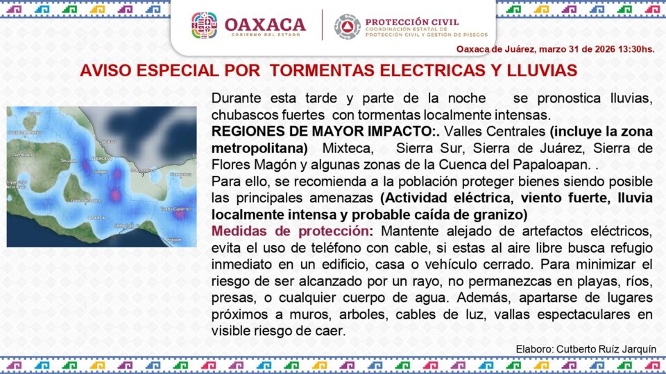 Oaxaca de Juárez, Oax. 31 de marzo de 2026.- La Coordinación Estatal de Protección Civil y Gestión de Riesgos (CEPCyGR) informa que, durante la tarde y parte de la noche de este martes, se pronostican lluvias, chubascos fuertes y tormentas localmente intensas en diferentes regiones de Oaxaca.