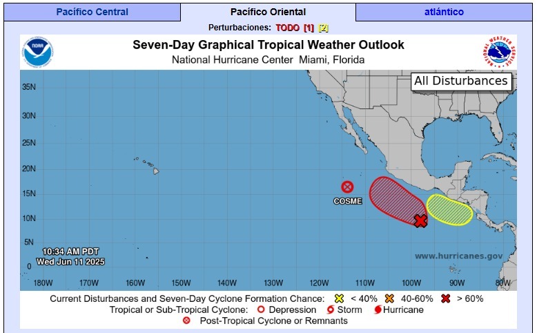 Oaxaca de Juárez, Oax. 11 de junio de 2025.- La Coordinación Estatal de Protección Civil y Gestión de Riesgos (CEPCyGR) informa que las condiciones de la zona de baja presión ubicada al sur del Golfo de Tehuantepec, son altamente favorables para el desarrollo de un sistema ciclónico en los próximos días, conforme se desplace hacia el oeste-noroeste.