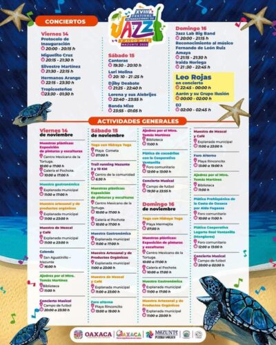 Además de los conciertos, se realizarán actividades alternas como liberación de tortugas, muestra artesanal, exposición de productos orgánicos, exhibición de mezcal y café, torneo de ajedrez, sesiones de yoga y una carrera deportiva. Estas acciones buscan fortalecer el turismo cultural y ecológico en Mazunte, Pueblo Mágico, y sus alrededores.