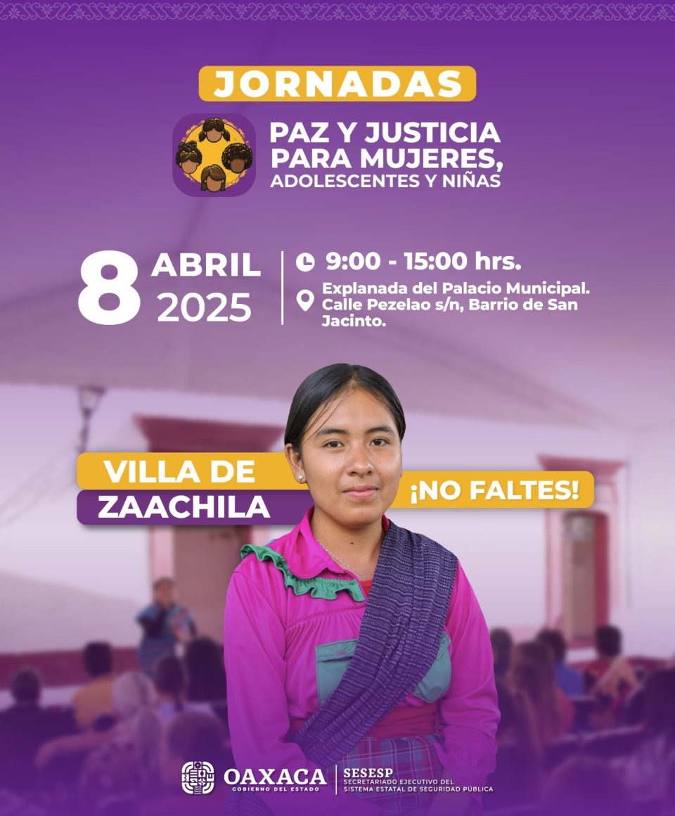 Oaxaca de Juárez, Oax., 4 de abril de 2025.- En el marco de las acciones coordinadas para promover entornos seguros, equitativos y libres de violencia que impulsa el Gobierno del Estado, este próximo 8 de abril se llevará a cabo la Jornada de Paz y Justicia para Mujeres, Adolescentes y Niñas en la Villa de Zaachila.