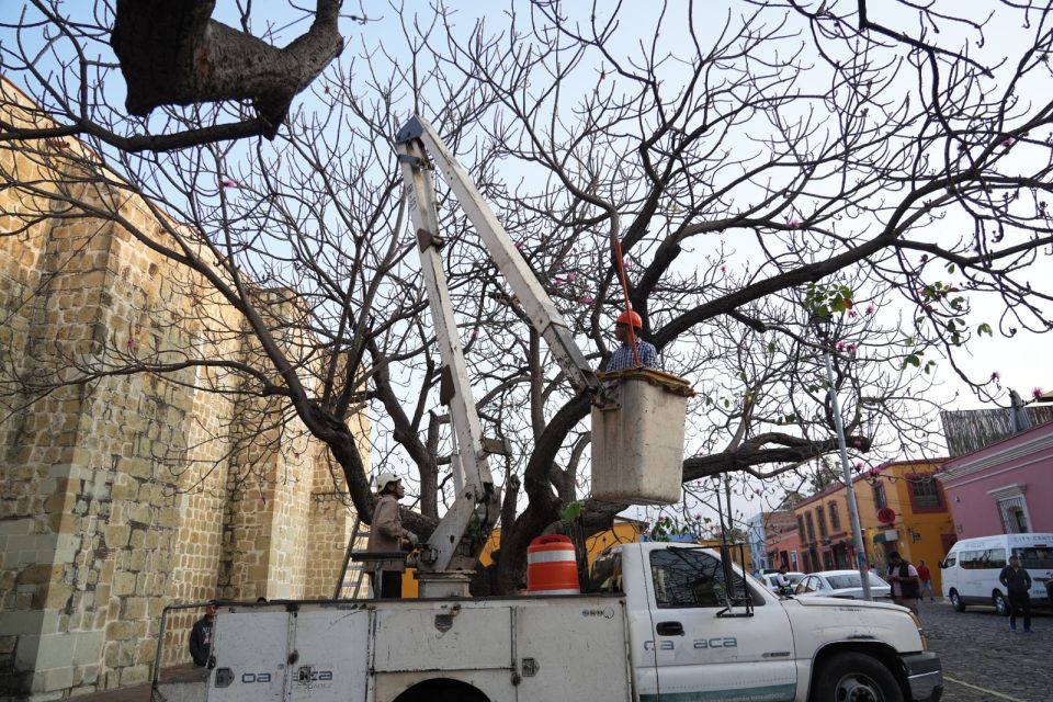 Oaxaca de Juárez, Oax. 01 de abril de 2025.- El Gobierno del Estado a través de la Secretaría de Medio Ambiente, Biodiversidad, Energías y Sostenibilidad realizó la poda fitosanitaria de los árboles emblemáticos ubicados en el atrio del templo de San Matías Jalatlaco, los cuales se encuentran catalogados desde el año 2009 como Árboles Notables en el Estado.