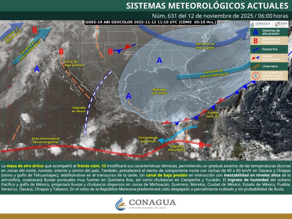 De acuerdo con el pronóstico del tiempo emitido por la Comisión Nacional del Agua (Conagua), esto se debe a que la masa de aire que impulsa al frente frío número 13, entrará en proceso de modificación.