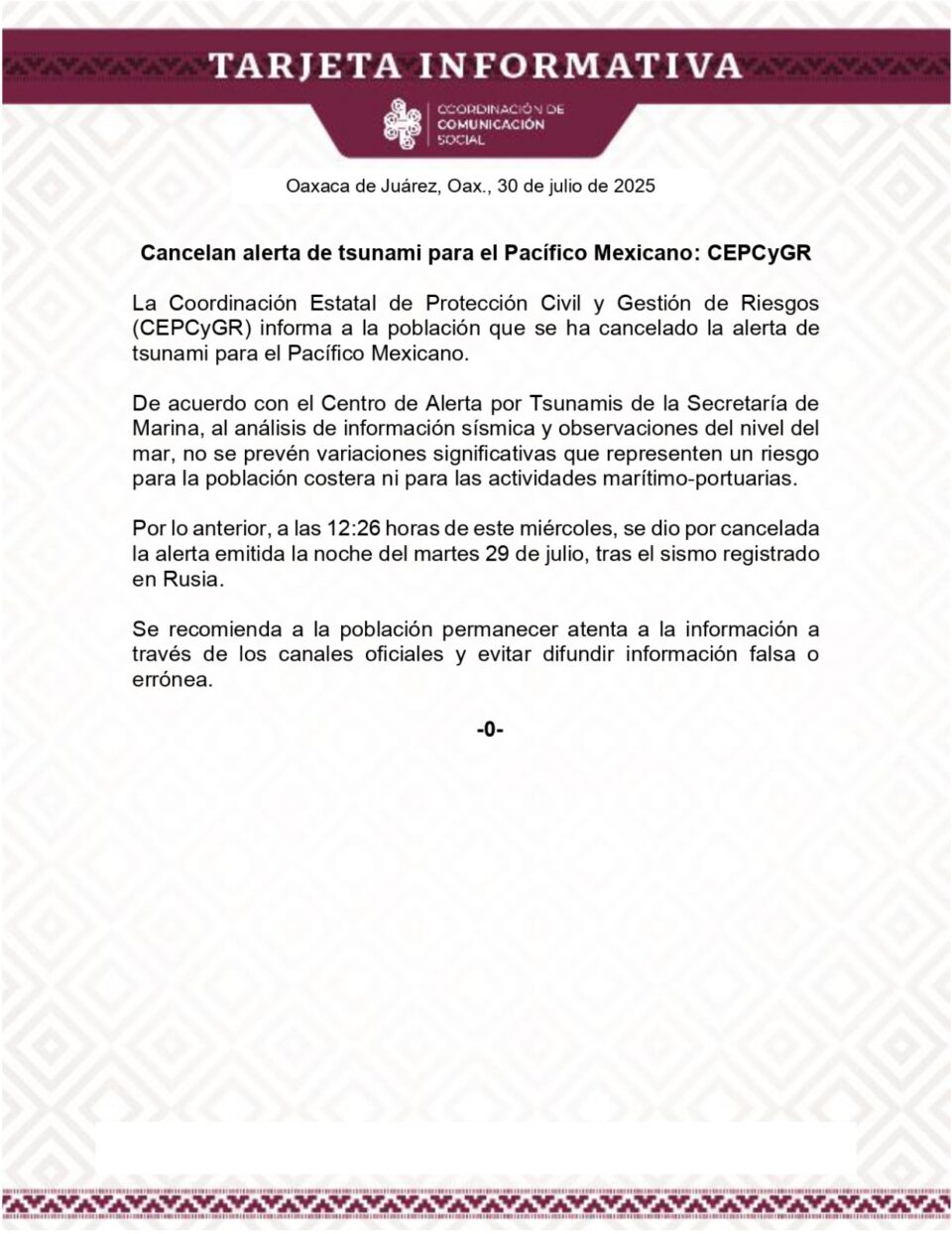 La Coordinación Estatal de Protección Civil y Gestión de Riesgos (CEPCyGR) informa a la población que se ha cancelado la alerta de tsunami para el Pacífico Mexicano.