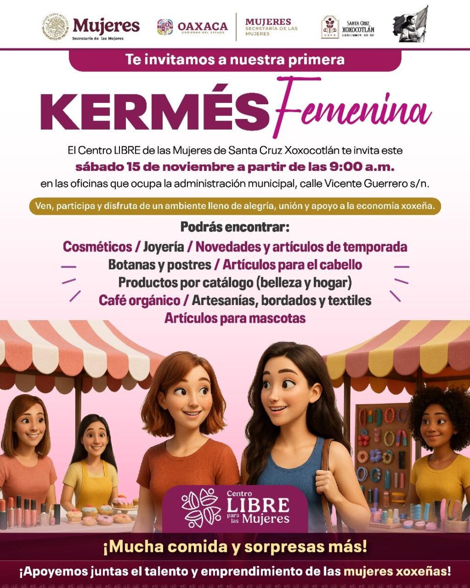 Santa Cruz Xoxocotlán, Oax., 12 de noviembre de 2025.- Con el respaldo del Ayuntamiento, el Centro LIBRE de las Mujeres de Xoxocotlán realizará el próximo sábado 15 de noviembre, la primera Kermés Femenina, cuyo propósito es fomentar la convivencia, la unión comunitaria y el apoyo a la economía local, especialmente a las mujeres emprendedoras del municipio.