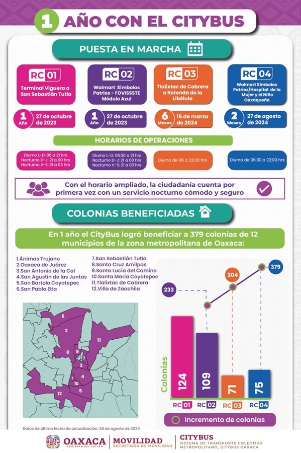 Este sistema actualmente beneficia a 379 colonias de 12 municipios de la Zona Metropolitana de Oaxaca. Desde su lanzamiento, ha ampliado su recorrido de 53.50 kilómetros (km) con la entrada en operación de las rutas RC01 y RC02, a 106.95 km con la puesta en marcha de las rutas RC03 y RC04, duplicando así la distancia total y mejorando notablemente la conectividad entre localidades.