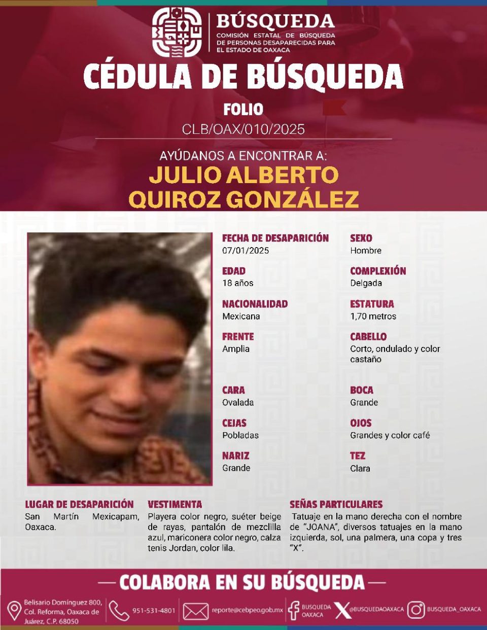 En el marco de la conferencia de prensa, el Mandatario estatal señaló que, tras diversas denuncias públicas, giró instrucciones a la Secretaría de Gobierno (Sego) y a la Comisión Estatal de Búsqueda de Personas Desaparecidas en Oaxaca (CEBPDO), para que contactaran a las familias de las víctimas.