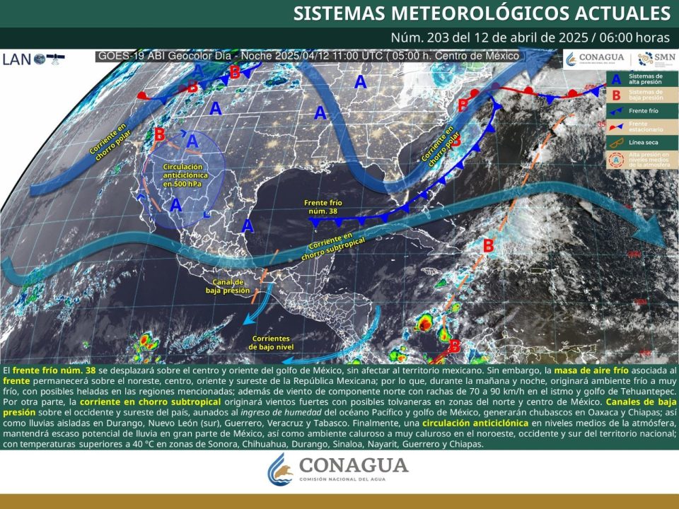 Oaxaca de Juárez, Oax. 12 de abril de 2025.- La Coordinación Estatal de Protección Civil y Gestión de Riesgos (CEPCyGR) informa que, para este sábado, el frente frío número 38 debilitado se desplazará rápidamente sobre el centro y oriente del Golfo de México sin afectar al país.