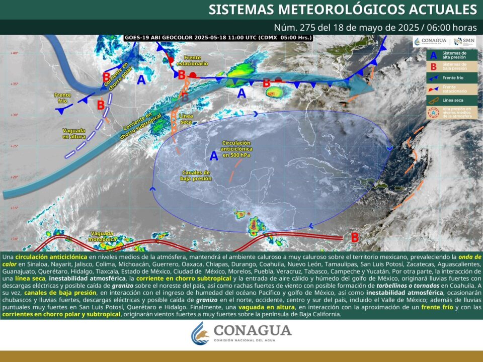 Además, algunas nubes poco densas en combinación con efectos orográficos pueden generar áreas de chubascos y tormentas aisladas en zonas montañosas de la Cuenca del Papaloapan y Sierra de Juárez.
