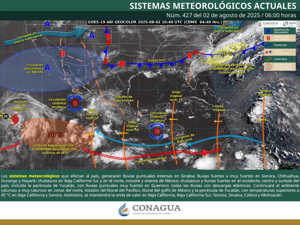 Oaxaca de Juárez, Oax. 2 de agosto de 2025.- La Coordinación Estatal de Protección Civil y Gestión de Riesgos (CEPCyGR) informa que, un canal de baja presión, una baja superior sobre Guatemala y la onda tropical número 19; seguirán incentivando procesos de lluvias de intensidad variable en mayor parte del estado.