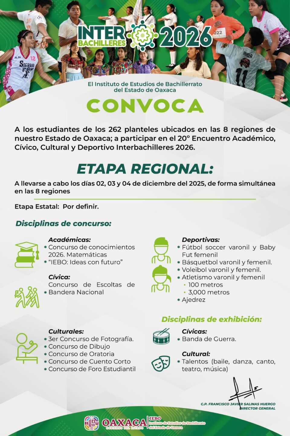 Oaxaca de Juárez, Oax. 20 de octubre de 2025.- El Instituto de Estudios de Bachillerato del Estado de Oaxaca (IEBO) invita a su comunidad a participar en el Encuentro Académico, Cívico, Cultural y Deportivo Interbachilleres 2026 en su etapa regional, cuyo fin es impulsar la formación integral del estudiantado en sus 262 planteles de la entidad.