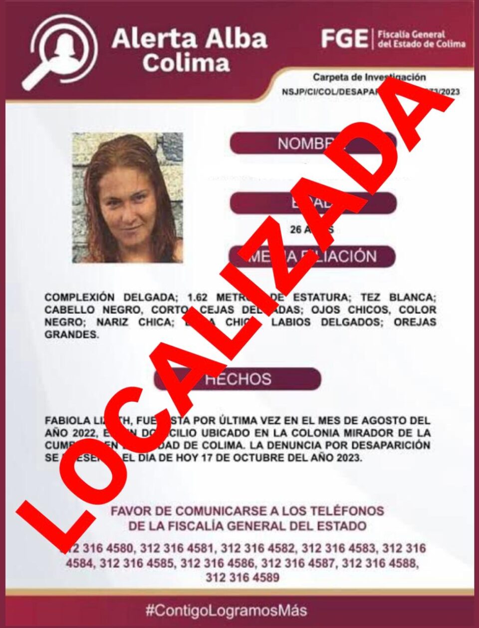 Mediante la verificación de datos en plataformas oficiales, se detectó una cédula de búsqueda activa en el estado de Colima, emitida en noviembre de 2022, a nombre de la referida persona.