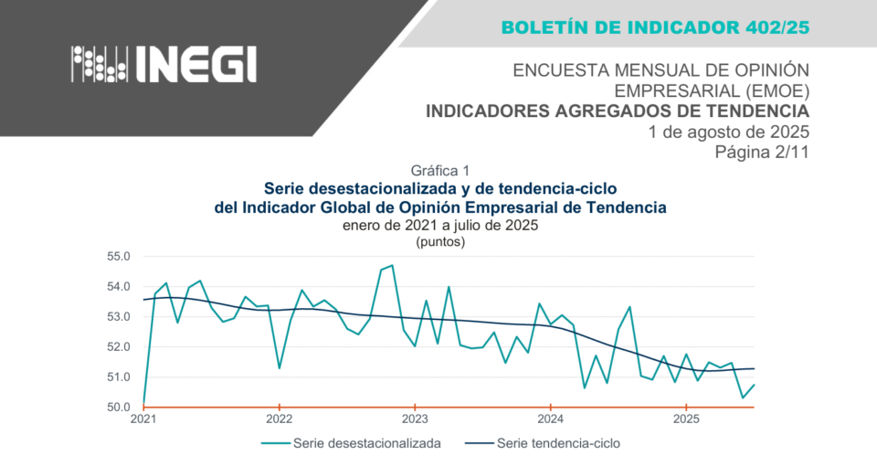 El Indicador Global de Opinión Empresarial de Tendencia (IGOET) se ubicó en 50.7 puntos, con un ligero aumento mensual pero una caída anual de 1.8 puntos. Esto indica que, aunque la percepción empresarial no es catastrófica, tampoco es alentadora.
