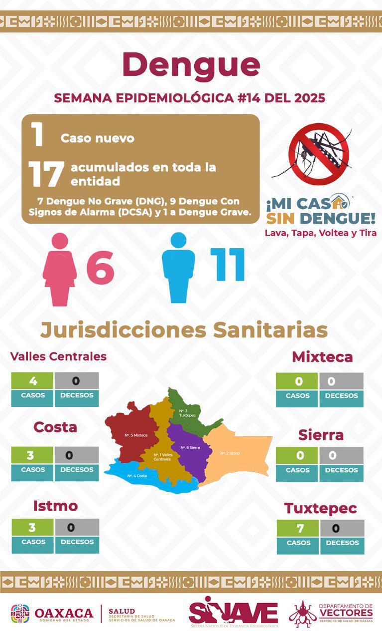 A nivel estatal, Servicios de Salud de Oaxaca han notificado un total de 17 casos acumulados: la Jurisdicción Sanitaria 3 Tuxtepec, registra siete casos, seguido de Valles Centrales con cuatro reportes, el Istmo y la Costa, tres cada uno, mientras la Sierra con cero casos.