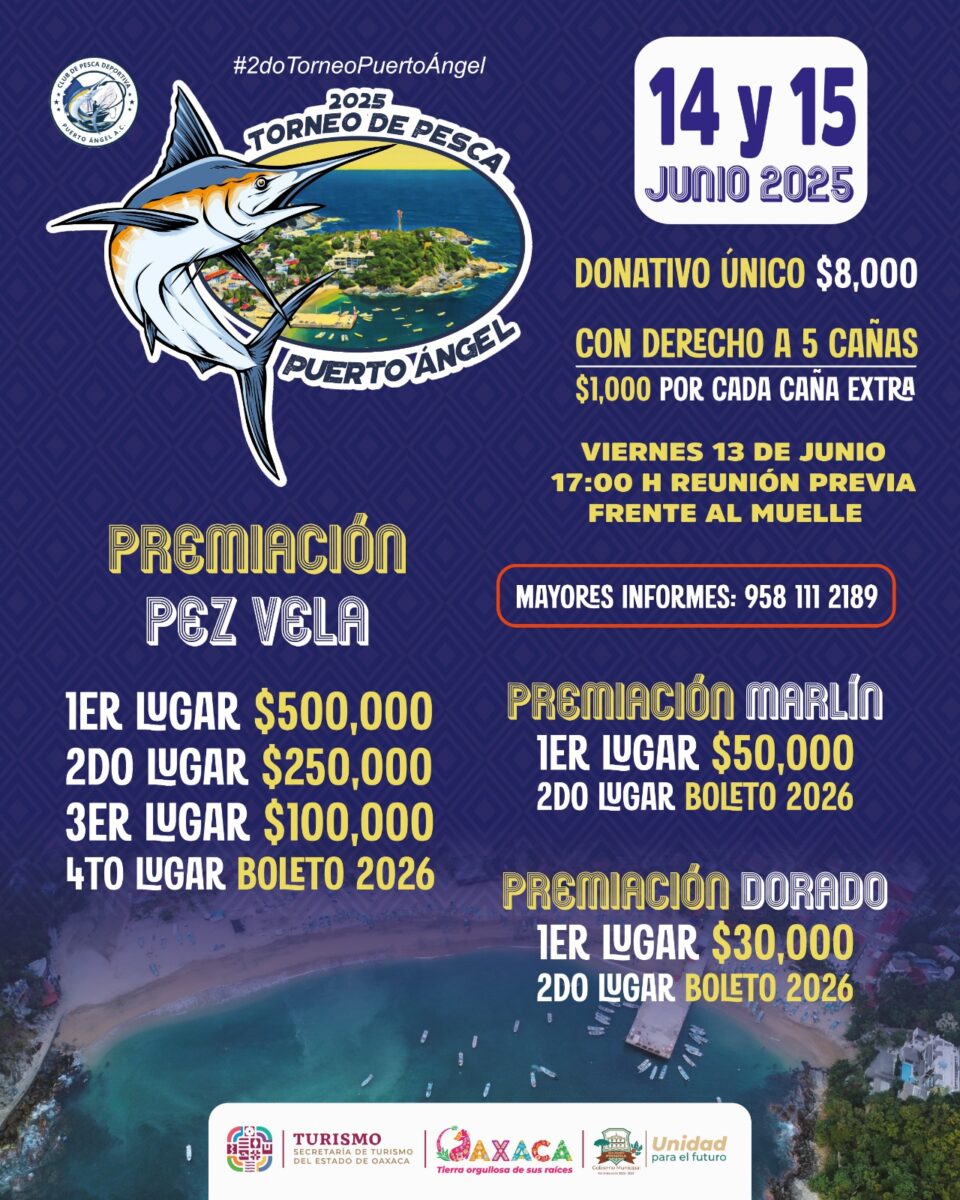 Oaxaca de Juárez, Oax. 11 de junio de 2025.- La Secretaría de Turismo (Sectur Oaxaca) informa que el Segundo Torneo de Pesca Deportiva Puerto Ángel 2025, se realizará el sábado 14 y domingo 15 de junio, en el que se espera la participación de 150 a 200 embarcaciones nacionales e internacionales.