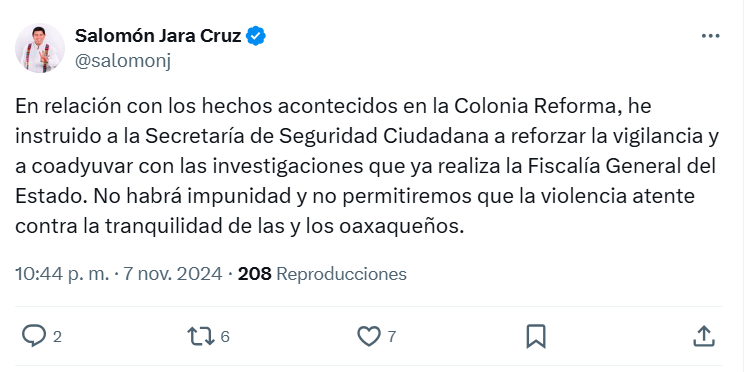 Luego de recibir el reporte de los hechos, se activaron los protocolos de investigación pertinentes, a cargo de la Fiscalía Especializada para la Atención a Delitos de Alto Impacto, personal especializado en diferentes materias se trasladó a la calle de las Rosas, frente a un restaurante ubicado en la colonia Reforma, de la ciudad de Oaxaca de Juárez.