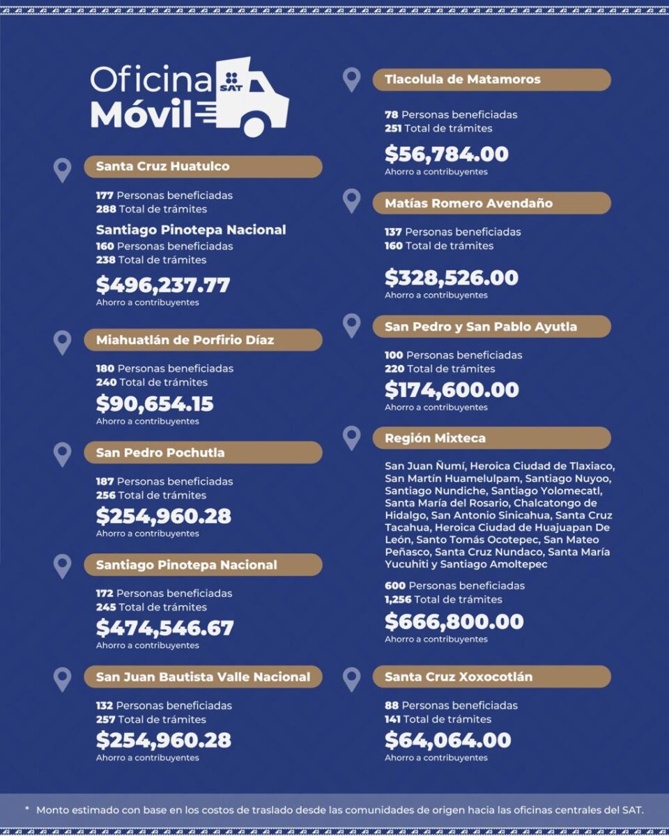 Estas acciones representaron un ahorro global de 2 millones 735 mil 172 pesos, calculado en función de los gastos de traslado que se hubieran requerido desde las comunidades de origen, hacia las oficinas centrales del SAT.
