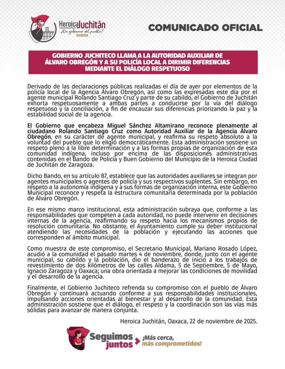 Derivado de las declaraciones públicas realizadas el día de ayer por elementos de la policía local de la Agencia Álvaro Obregón, así como las expresadas este día por el agente municipal Rolando Santiago Cruz y parte de su cabildo, el Gobierno de Juchitán exhorta respetuosamente a ambas partes a conducirse por la vía del diálogo respetuoso y la conciliación, a fin de encauzar sus diferencias priorizando la paz y la estabilidad social de la agencia.
