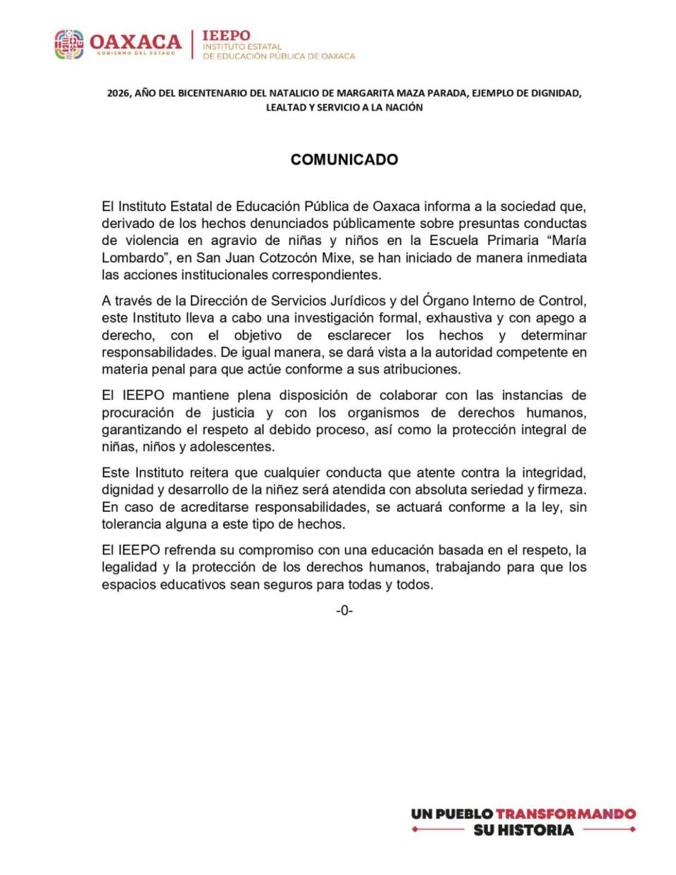El Instituto Estatal de Educación Pública de Oaxaca (IEEPO) informó que, tras las denuncias públicas sobre presuntas conductas de violencia en agravio de niñas y niños de la Escuela Primaria “María Lombardo”, ubicada en San Juan Cotzocón Mixe, se activaron de inmediato los procedimientos institucionales para esclarecer los hechos. La autoridad educativa señaló que la prioridad es garantizar la protección integral de la niñez y asegurar que los espacios escolares operen bajo condiciones de seguridad y respeto.