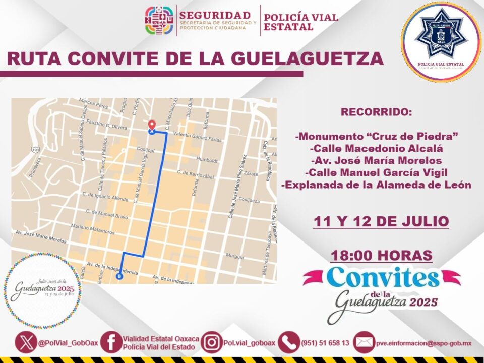 En los convites, que comenzarán a partir de las 18:00 horas este viernes 11 y el sábado 12 de julio, partiendo de la Cruz de Piedra, avanzando por las calles de Macedonio Alcalá y García Vigil, hasta concluir en la Alameda de León, se realizarán cortes a la circulación vehicular en las calles de Mariano Abasolo, y las avenidas José María Morelos e Independencia.