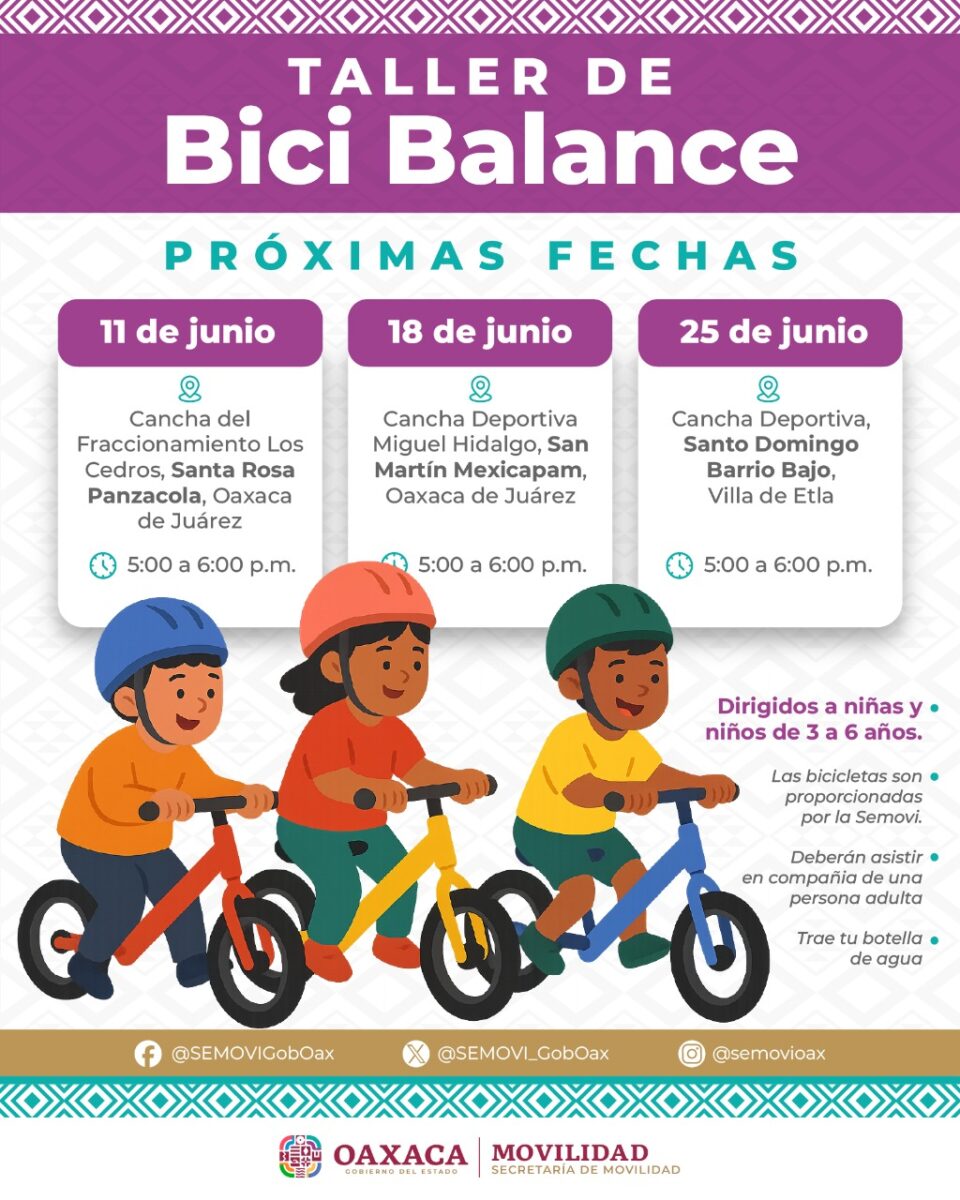 San Antonio de la Cal, Oax. 5 de junio de 2025.- El Gobierno del Estado, a través de la Secretaría de Movilidad (Semovi), impulsa actividades mediante el taller Bici Balance, estrategia permanente, educativa y lúdica, dirigida a niñas y niños de entre 3 a 6 años de edad para promover una transportación sostenible.