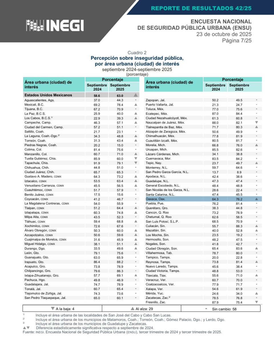 En septiembre de 2025, 63.0 % de la población de 18 años y más, residente en 91 áreas urbanas de interés, consideró que era inseguro vivir en su ciudad. Lo anterior representa un cambio estadísticamente significativo en relación con el porcentaje que se registró en septiembre de 2024 (58.6 %); sin embargo, no representa un cambio estadísticamente significativo en relación con el porcentaje de junio de 2025 (63.2 %). En esta edición de la ENSU, 15 áreas urbanas de interés presentaron cambios estadísticamente significativos frente a junio de 2025: 10 con reducciones y 5 con incrementos.