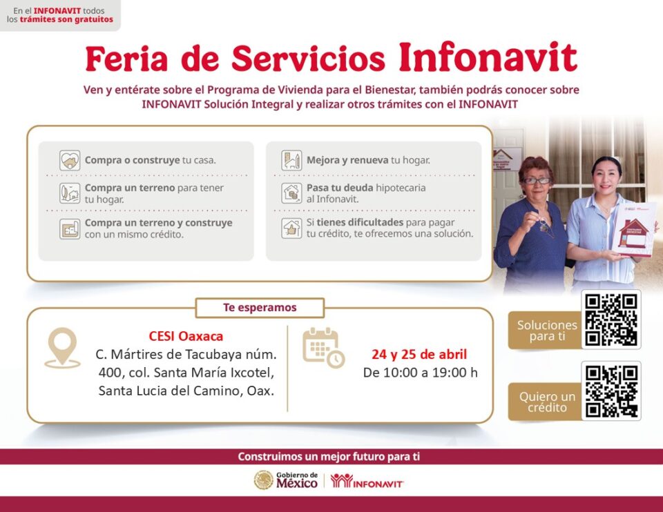 El INFONAVIT llevará a cabo su Feria de Servicios en Oaxaca, Oaxaca, el próximo viernes 24 y sábado 25 de abril de 10:00 a 19:00 horas, con el fin de asesorar a las y los trabajadores interesados en obtener un crédito, además de ofrecer alternativas de pago a quienes enfrentan dificultades para cubrir sus mensualidades.