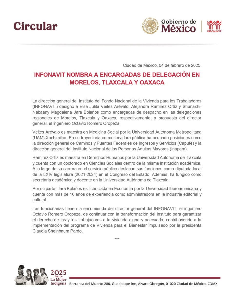La dirección general del Instituto del Fondo Nacional de la Vivienda para los Trabajadores (INFONAVIT) designó a Elsa Julita Veites Arévalo, Alejandra Ramírez Ortíz y Shunaxhi-Nabaany Magdalena Jara Bolaños como encargadas de despacho en las delegaciones regionales de Morelos, Tlaxcala y Oaxaca, respectivamente, a propuesta del director general, el ingeniero Octavio Romero Oropeza.