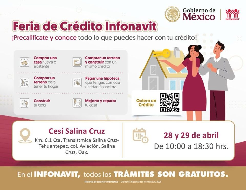 La atención se brindará el lunes 28 y martes 29 de abril, de 10:00 a 18:30 horas, en el Centro de Servicio INFONAVIT (Cesi) Salina Cruz, ubicado en Km. 6.1 carretera Transístmica Salina Cruz-Tehuantepec, colonia Aviación.
