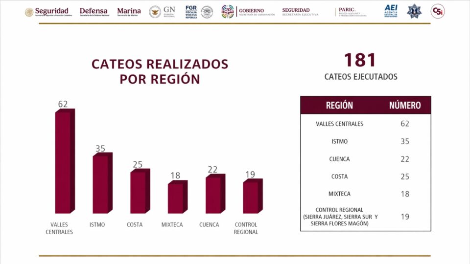 Oaxaca de Juárez, Oax., a 24 de abril de 2026.- La Fiscalía General del Estado de Oaxaca (FGEO) informa sobre la efectividad de sus procesos de investigación que permitieron la ejecución de 181 cateos en las diversas regiones de la entidad en lo que va de este año. Este esfuerzo interinstitucional es una respuesta directa a las denuncias ciudadanas y al análisis del Gabinete de Seguridad.