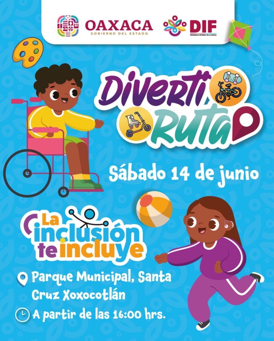 Oaxaca de Juárez, Oax., 12 de junio de 2025.- La trigésima octava edición de la Diverti Ruta a cargo del Sistema para el Desarrollo Integral de la Familia (DIF) Oaxaca será inclusiva y se llevará a cabo este sábado 14 de junio de 16:00 a 19:00 horas, en el parque municipal de Santa Cruz Xoxocotlán.