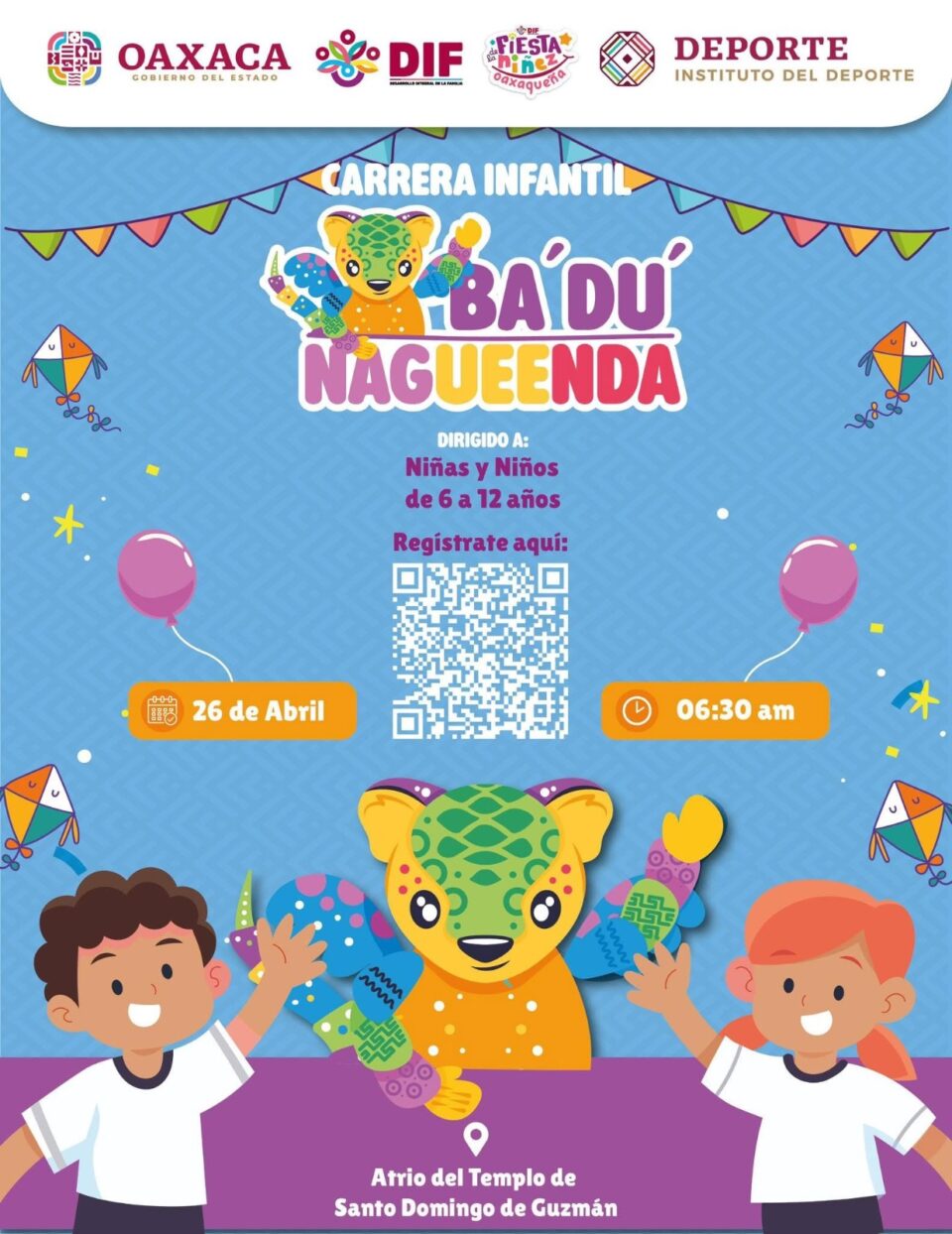 📢 El Sistema para el Desarrollo Integral de la Familia (DIF) Oaxaca, en coordinación con el Instituto del Deporte del Estado (Indeporte), invita a niñas y niños de 6 a 12 años a participar en la carrera atlética infantil «BA´DU´NAGUEENDA», este 26 de abril a las 7:00 horas, en el atrio del Templo de Santo Domingo de Guzmán. 🏃🏽‍♀️🏃🏽