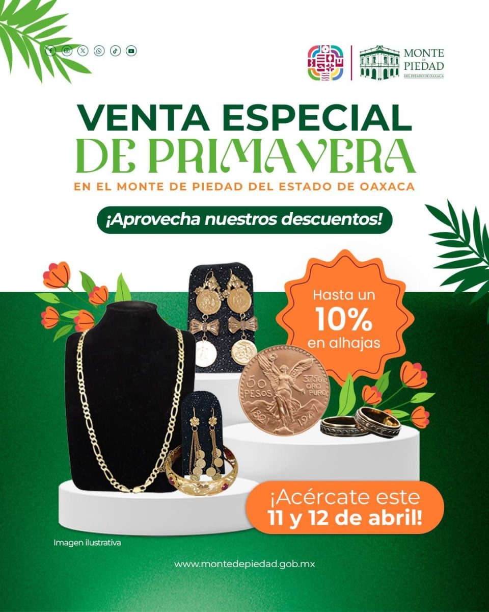 Oaxaca de Juárez, Oax. 5 de abril de 2025.- El Monte de Piedad del Estado de Oaxaca llevará a cabo la “Venta Especial de Primavera” el 11 y 12 de abril, en sus 25 sucursales de la entidad.