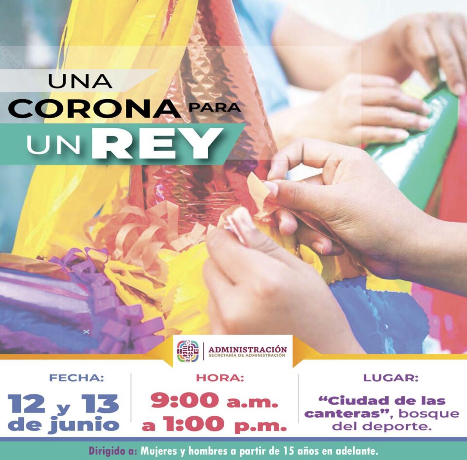 En el mismo espacio, se desarrollará el taller “Una corona para un rey”, en el que las y los participantes podrán elaborar una piñata de tambor con temática de botella en 3D. Este encuentro, creativo y de expresión artística, se llevará a cabo los días jueves 12 y viernes 13 de junio, en un horario de 9:00 a 13:00 horas, dirigido a mujeres y hombres a partir de los 15 años.