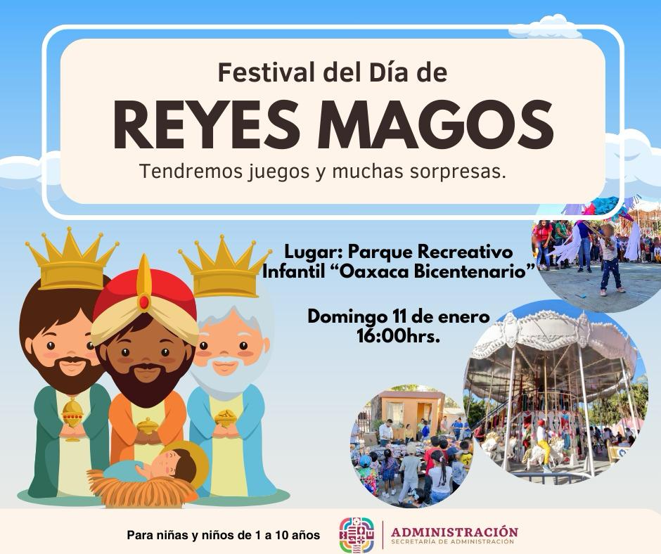 Tlalixtac de Cabrera, Oax. 9 de enero de 2026.- La Secretaría de Administración invita a niñas y niños de 1 a 10 años, a celebrar el Festival de Día de Reyes este domingo 11 de enero, en el Parque Recreativo Infantil Oaxaca Bicentenario.