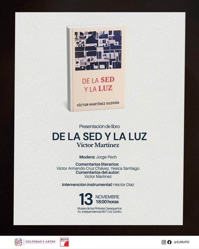 Oaxaca de Juárez, Oax. 12 de noviembre de 2025.– La Secretaría de las Culturas y Artes de Oaxaca (Seculta) invita a la presentación del poemario “De la sed y la luz” del compositor, cantante y escritor, Víctor Martínez Guzmán; que se llevará a cabo el jueves 13 de noviembre a las 18:00 horas, en el Museo de los Pintores Oaxaqueños (Mupo).