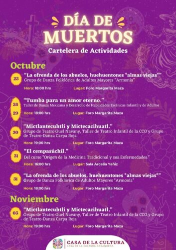 Oaxaca de Juárez, Oax. 27 de octubre de 2024.- En el marco de las festividades de Día de Muertos, la Casa de la Cultura Oaxaqueña (CCO) ha programado una serie de actividades alusivas a esta tradicional celebración, que se llevarán a cabo del 28 al 31 de este mes, con el objetivo de contribuir a su preservación entre las nuevas generaciones.