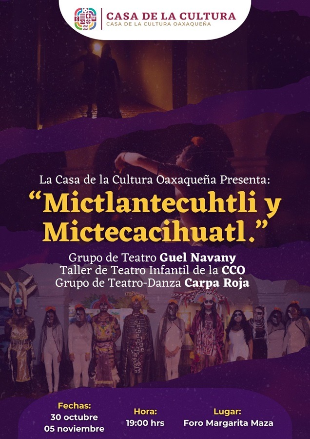 El miércoles 30, a las 19:00 horas en este mismo foro se realizará la obra de teatro “Mictlantecuhtli y Mictecacihuatl”, por el Grupo Representativo de Teatro “Guel Navany” a cargo del maestro Hassael Tejada, el Taller de Teatro infantil de la CCO y el Grupo de Teatro-Danza Carpa Roja.