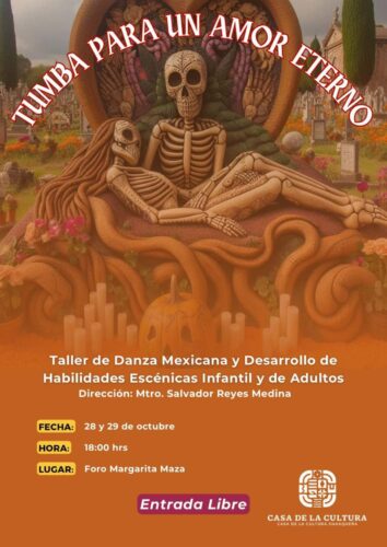 El lunes 28 y martes 29 de octubre, el Foro Margarita Maza Parada será el escenario en el que integrantes del taller de Danza Mexicana y Desarrollo de Habilidades Escénicas Infantil y de Adultos, bajo la dirección del maestro Salvador Reyes Medina, realizarán a las 18:00 horas la puesta en escena “Tumba para un Amor Eterno”, una emotiva presentación multidisciplinaria dedicada a todas las personas que han perdido a un ser amado.