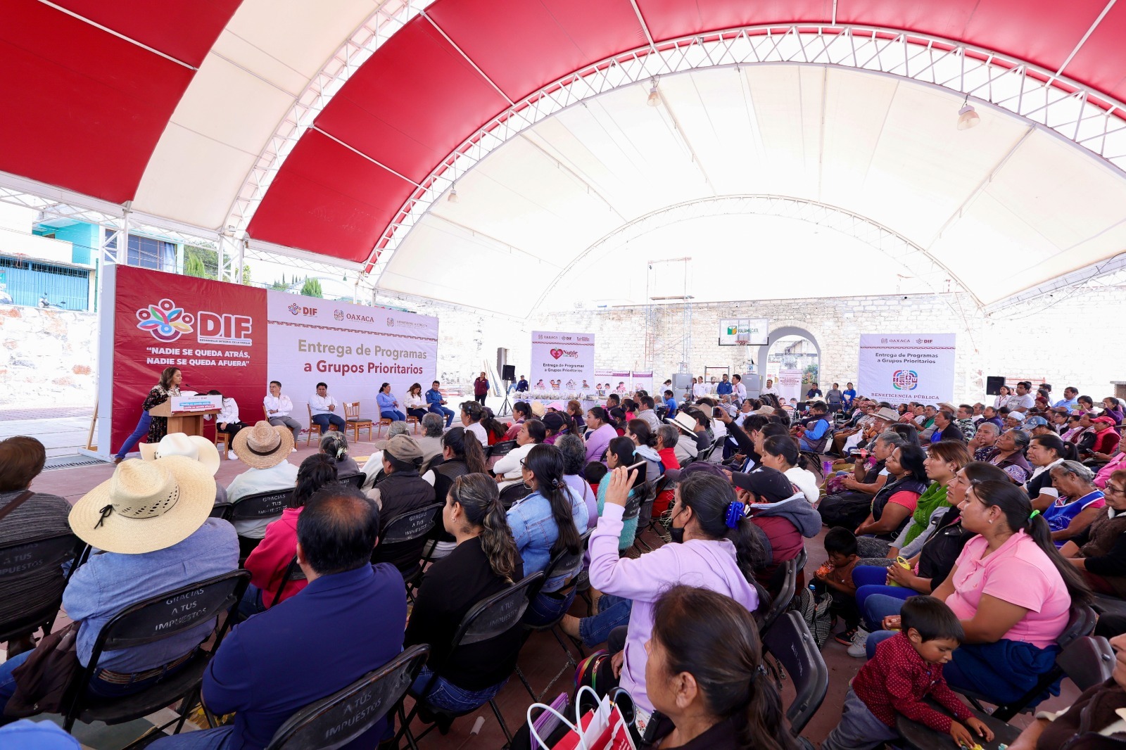 Regiones Mixteca y Valles Centrales, Oax., 12 de noviembre de 2024.- Con alegría, las y los habitantes de ambas regiones recibieron a la Presidenta Honoraria del Sistema para el Desarrollo Integral de la Familia (DIF) Oaxaca, Irma Bolaños Quijano para ser beneficiarios de los Programas a Grupos Prioritarios, entre los que destacan equipamientos a comedores, dotaciones alimentarias, lentes de vista cansada y aparatos funcionales, los cuales les permiten mejorar su condición de vida.