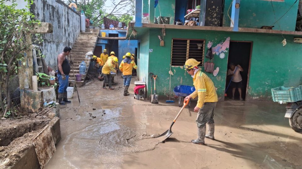 Brigadistas combatientes forestales de la Coesfo realizan un trabajo continúo en la pica y desrame de árboles caídos, limpieza de 36 calles y retiro de material acarreado por el agua; además de apoyo directo a 76 viviendas afectadas. Su esfuerzo ha permitido restablecer el tránsito vehicular y las condiciones de seguridad en colonias como 25 de Abril y Pantepec.