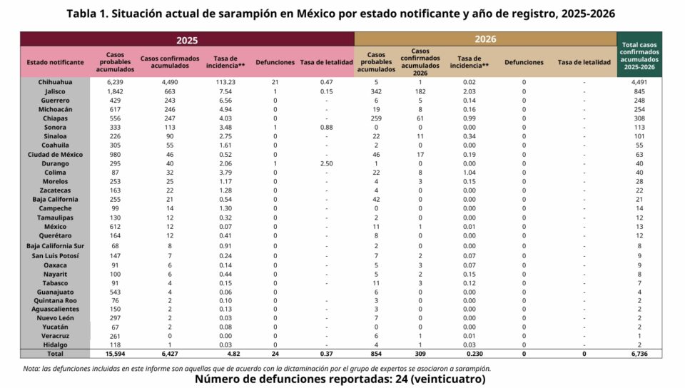 El informe también confirma 24 defunciones asociadas al sarampión, dictaminadas por el grupo de expertos. Chihuahua concentra la mayor carga histórica del brote con 4,490 casos confirmados en 2025, mientras que Jalisco, Chiapas y la Ciudad de México muestran incrementos relevantes en los registros más recientes de 2026 gob.mx.