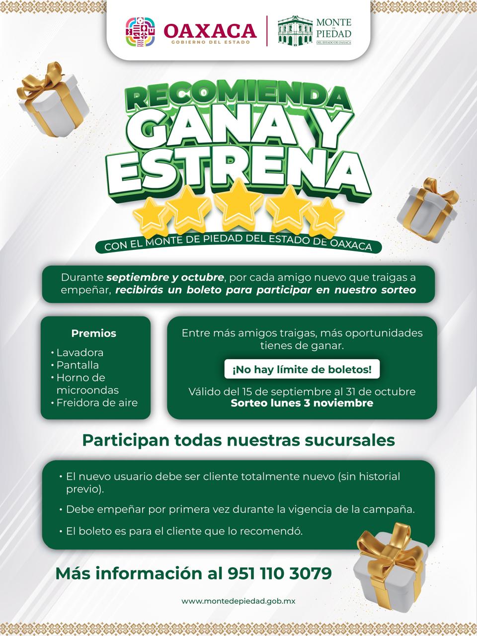 El Monte de Piedad del Estado de Oaxaca activó su campaña “Recomienda, gana y estrena”, una iniciativa que premia la participación activa de sus usuarios con artículos útiles para el hogar. La gerente de la sucursal 21 en Tlacolula, Gladys Cruz López, detalló que la dinámica estará vigente del 15 de septiembre al 31 de octubre.