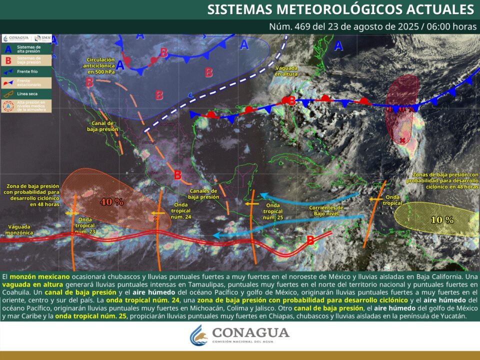 Esto, debido a la onda tropical número 25 y un canal de baja presión sobre el sureste de México, así como el ingreso de humedad del Océano Pacífico y Golfo de México que estarán en interacción.