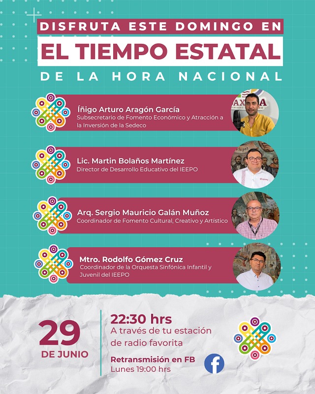 La transmisión estará disponible a partir del lunes 7 de julio de 2025, a las 19:00 horas, a través de la página oficial de Facebook Live: El Tiempo Estatal de la Hora Nacional. Asimismo, las y los interesados podrán encontrar material adicional en la cuenta de Instagram: @eltiempoestataloaxaca.