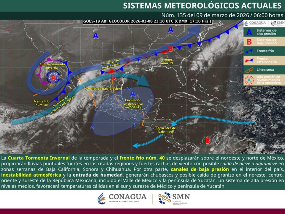 Esto se debe a la presencia de un canal de baja presión localizado sobre el sureste del país, en combinación con la entrada de humedad proveniente del océano Pacífico y Golfo de México.