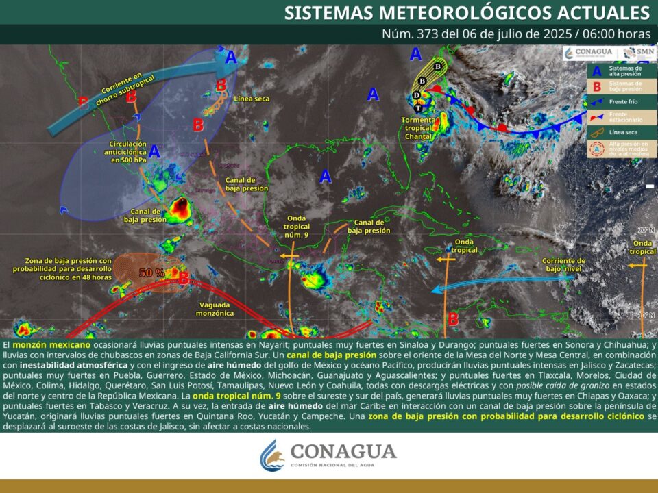 Oaxaca de Juárez, Oax. 6 de julio de 2025.- La Coordinación Estatal de Protección Civil y Gestión de Riesgos (CEPCyGR) informa que, este domingo, la onda tropical número 9 se volcará sobre Oaxaca, principalmente en el oriente de la entidad, dejando lluvias y tormentas aisladas, algunas asociadas con actividad eléctrica y rachas de viento.