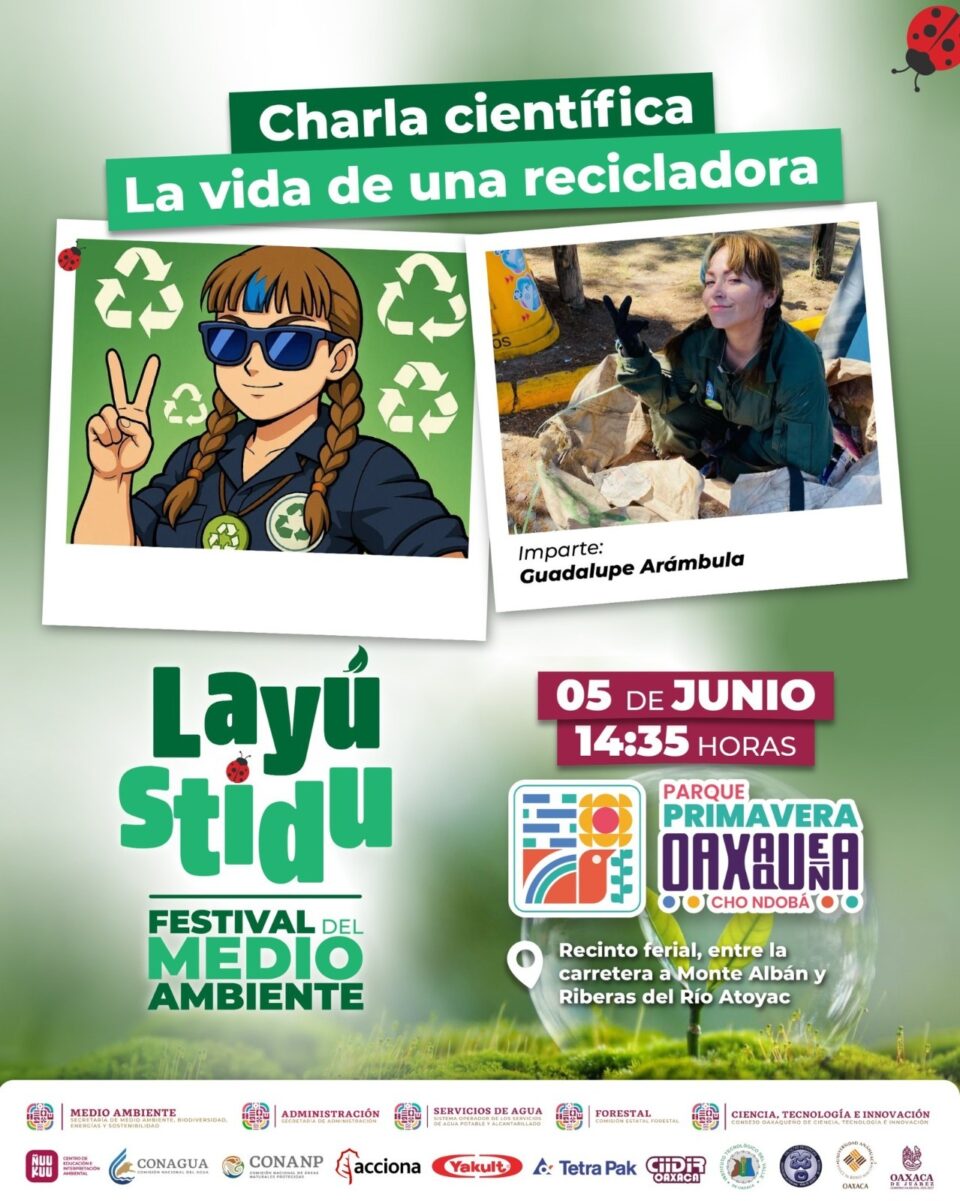 Oaxaca de Juárez, Oax. 4 de junio de 2025.- En el marco del Festival del Medio Ambiente “Layú Stidu”, que coordina la Secretaría de Medio Ambiente, Biodiversidad, Energías y Sostenibilidad, se presentará la charla científica y artística “La vida de una recicladora”, que busca visibilizar las múltiples formas de participación ciudadana en favor del medio ambiente.